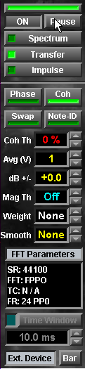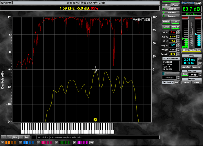 | 這個對應功能啟用後,曲線視窗下的頻率顯示刻度將會變成一個 100 鍵的鋼琴音鍵表,這個的樂理頻率對照大概是從 16 Hz 到 5K Hz 的範圍,SIA-5 提供此項的 輔助功能主要是當討論到系統工程師與音樂家之間的溝通語言時,這物理音程倍頻換算成八度音及 12 均律,可以讓音樂家的人仕在取得解釋的回答會比較清楚。 _ |