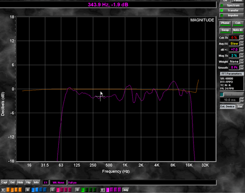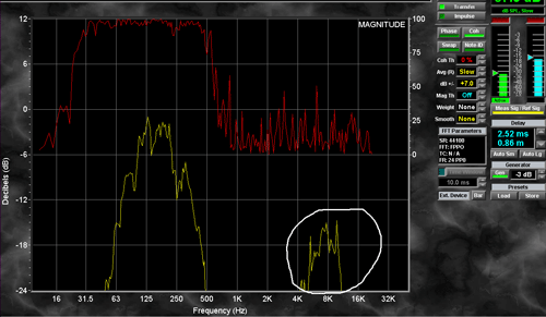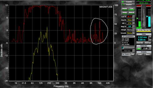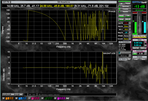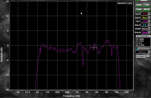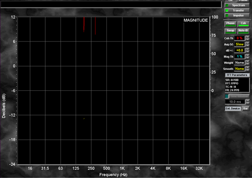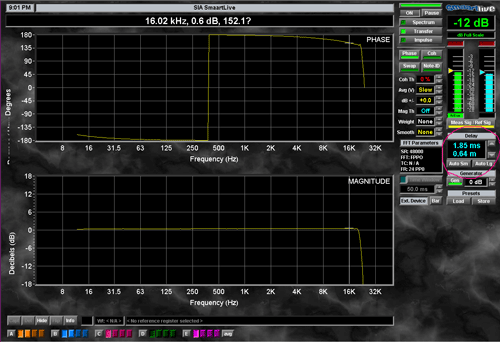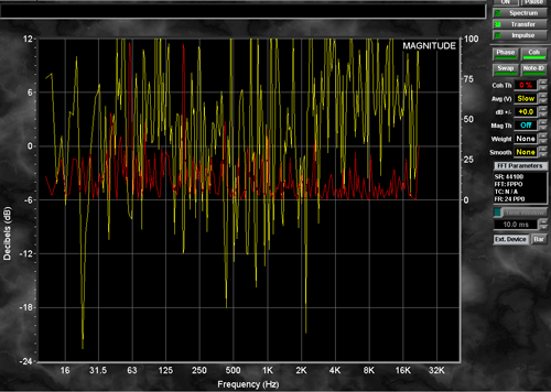 | Mag Th ( Magnitude Thresholding )規模定限, 使用 Transfer 量測訊號時,還有另一種方式去減少與避免完好的、干擾的外部訊號,Mag Th 就像是一個門檻,類似噪音閘之意,它的功能就是在 Channel-1( 右 ) 的輸入端插入這麼一個動作行為,數據是以百分比來增減調整的,從圖 M-1 的表示在一個沒有輸入訊號的時候,畫面出現這些敏銳的數學運算數據,現在試著把 Mag Th 加入,在圖 M-2 上你可以發現那些未過於 1% 門限的訊號全都被避掉了,如此就可以得到比較乾淨的數據顯示。 這樣的特性可以讓使用者的測試麥克風在擺放的位置如果是比較吵雜的,或地形地物之固容易誘導出梳形濾波效應, 那麼適當的 Mag Th 調整,將可避免掉量測失準。 |