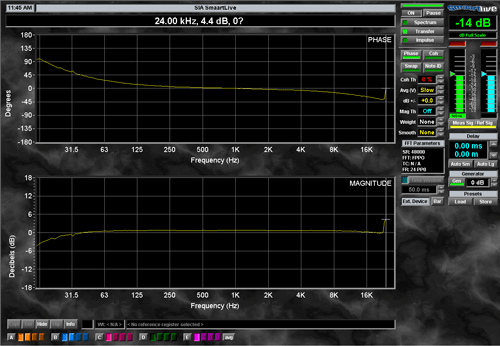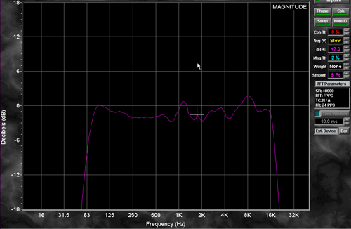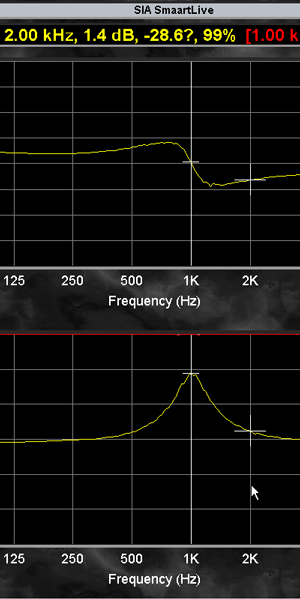 簡單的說就是從 500 Hz 0 dB ~ 1KHz 12 dB 的滾降升的曲線,你可以使用滑鼠上的十字標去查看位置,你去移動到 500 Hz 或是 2 KHz 的頻率點,這十字標會自動貼著頻率曲線來顯示數據,視窗的正上方會告訴你當下的頻率以及數值, 在這裡,1 KHz 增加到 12 dB,那麼 500 與 2K 的倍頻點照理應不受影響才對 ( 0 dB ),這裡的數據告訴我們它升高了 1.4 dB,雖然如此,此台機 EQ 還是在 + - 3 dB 的滾降誤差之內,這就是一個 Transfer 的比對數學,基本觀察一個 元件的過程。 |