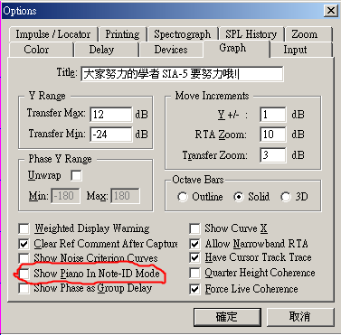 | Note ID ( 註解 ),在物理與樂理之間的一個比照的橋樑, 使用 Note ID 時,請先行滑鼠將Option/Graph的調整頁面把 Show Piano In Note-ID Mode 的位置打勾,然後在執行 量測時,隨時就可以在軟體面板上的Note ID呼叫出來。 |