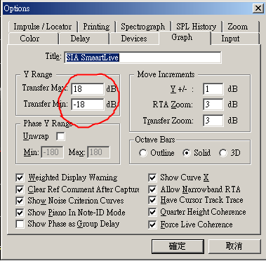 在上面的幾個圖示出現的大視窗,在刻度的指示上,最左方的 分貝 + - 指示在你沒去修改它,其預設是+18、-18 dB, 這是一個比對時訊號大小的一個參考,你可以去調整被測元件 的輸入 / 出端電平值來讓視窗上的曲線顯示可以在參考點上, 例如我們是在調整一台 + - 12 dB 的 EQ,那麼你可以把這個 值設定方式如下 : 用滑鼠去點入上方的 Option 字眼或是直接在視窗上按滑鼠 |