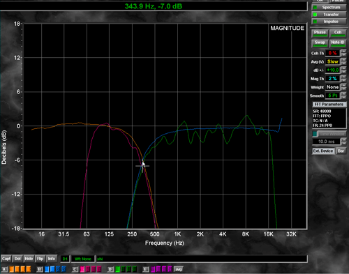| 量測一個聲音系統。 圖 S-1 是一個我舉例欲去測量的,多重的校準位置,那麼SIA-5一次只能顯示當下的即時數據,我們要如何規劃呢?在頻譜視窗下有一排4種顏色區分的截取欄, 利用它我們可以把一個系統的線路數據與實際揚聲器發出來的聲訊來做參考記錄下來以供列印。 圖 S-2 是一台兩音路的分音器輸出,我們以各種不同顏色來分別截取記憶下來,操作方式很簡單你只要選擇任一顏色 A、B、C、D、E 的字母,每個字母擁有 4 個 顏色記憶,此時的 Capt 的字眼會由灰變白的,表示可以使用,然後按下你所選取的字母色框就可以立刻的截取下來,利用快速鍵 Shift+Ctrl+A、B、C、D、E, 就會在那所選的色塊循序跳換,別忘了把抬頭寫好以免亂掉。 圖 S-3 是使用麥克風來截取各頻域的曲線,再把先前Crossover 所截取的記憶呼叫出來,( 橙色與藍色是 Crossover 輸出,紅色與綠色是小喇叭的輸出 ),如此你就 可以比較理想的分音器輸出與透過Yamaha 小喇叭出來的頻率曲線有什麼差別。 在圖 S-4 就可以把全頻輸出 ( 從 EQ 段截取的 ),與喇叭輸出全頻域曲線截取的全部呼叫出來做一個曲線比較。 還有通常過程頻域的修正並不是先去調動到 EQ 的,而是先行修正喇叭處理器內部的等化參數,EQ 的部份是要留給最後操作者在迴授因素或是即時的調整上使用 的,這方面的應用認知我就不多述,因為這牽涉到各個廠牌喇叭的與處理器的修正,還有最重要的是我手頭上的喇叭處理器沒有一台是可以與 SIA-5 相連結的, 這點我就真的很抱歉了,昂貴的沒有啦,不過最主要也是利用 SIA-5 與電腦上匯流排來連結支援的硬體,直接可以在軟體上修正曲線,有相關設備的人仕這方面 可以試試看。 |